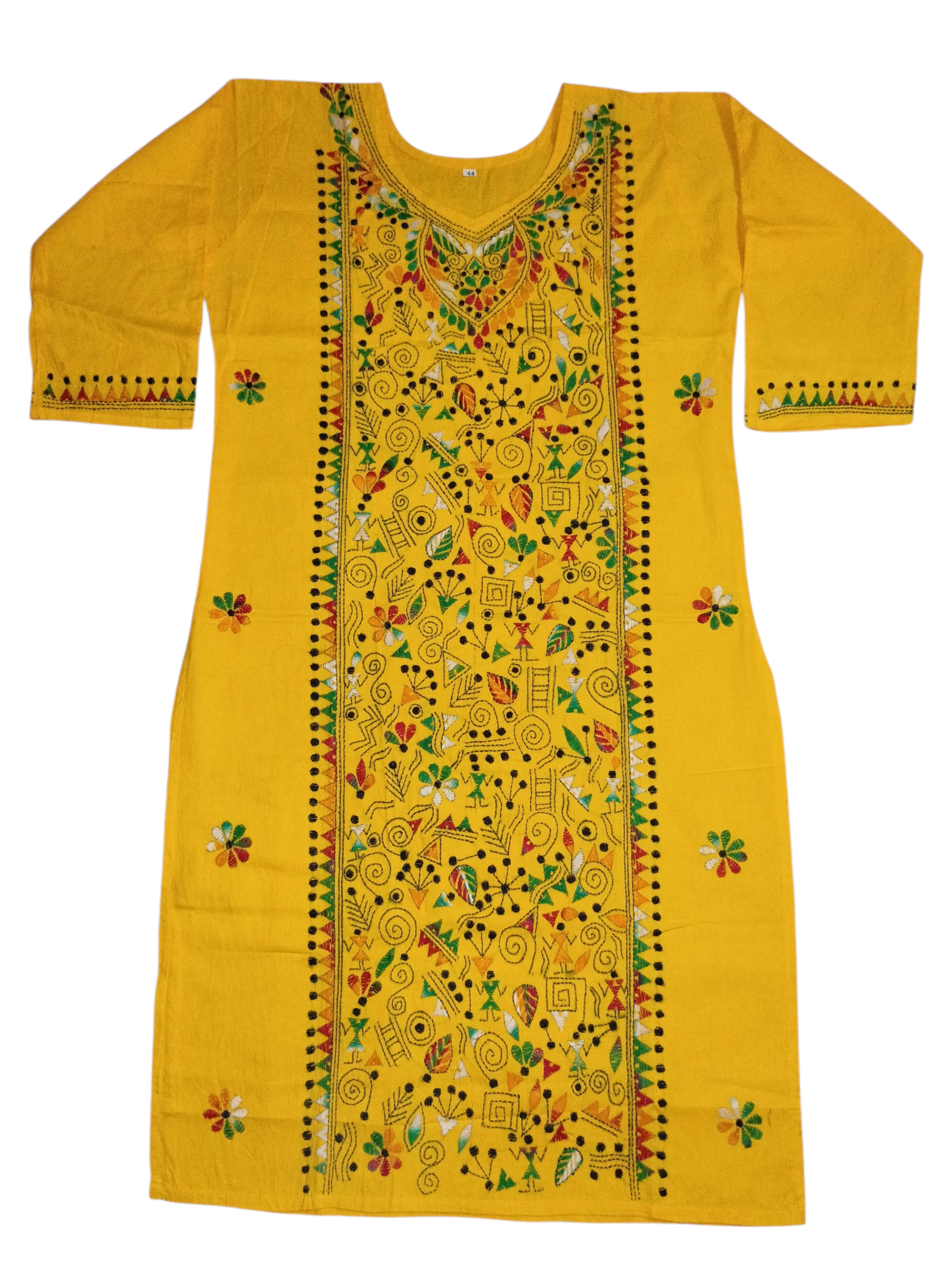Bring timeless elegance to your wardrobe with this stunning hand-embroidered Kantha stitch kurti. Crafted from pure cotton fabric, this piece beautifully blends traditional artistry with modern charm. The intricate Kantha embroidery on the neckline and front panel showcases fine craftsmanship and adds a touch of sophistication.